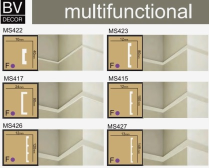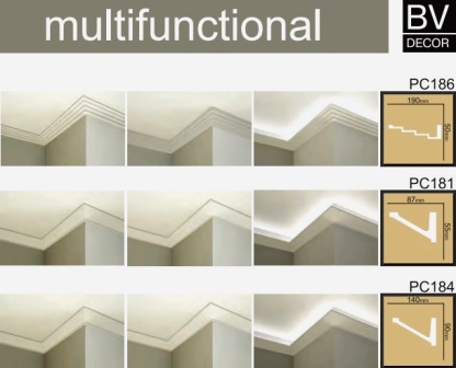 Le même élément unique peut être utilisé comme moulure, corniche et socle. Simple, facile et rapide à installer. Eléments architecturaux décoratifs pour éclairage indirect LED. Profil en polyuréthane de haute qualité.